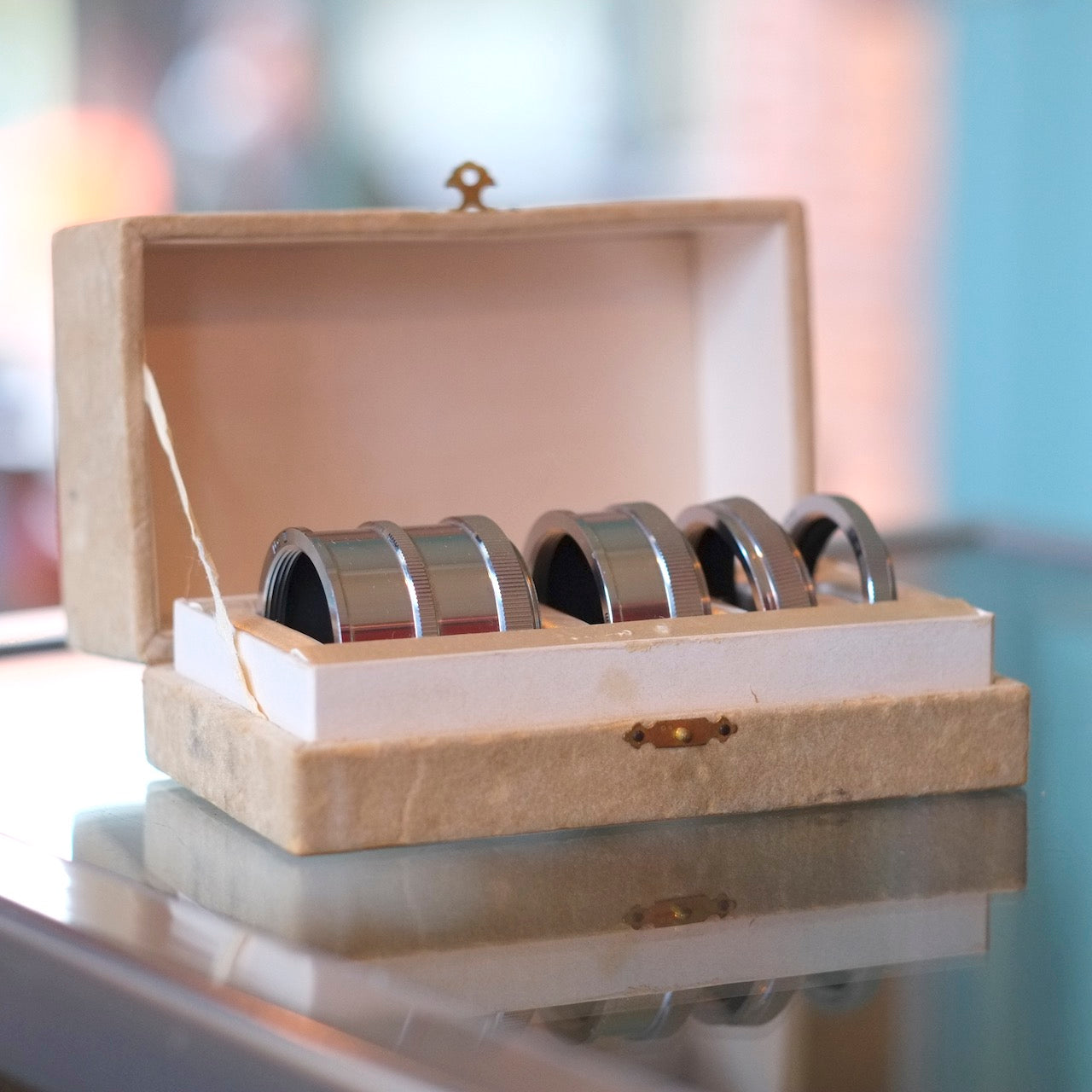 This is an original Asahi extension tube set for the Asahiflex camera and its M37 lensmount. Includes four tubes of varying lengths that can be used alone or in combination to increase close-up capability with compatible lenses (that is to say, Asahiflex lenses with an M37 lens mount.) In excellent condition, with original case.