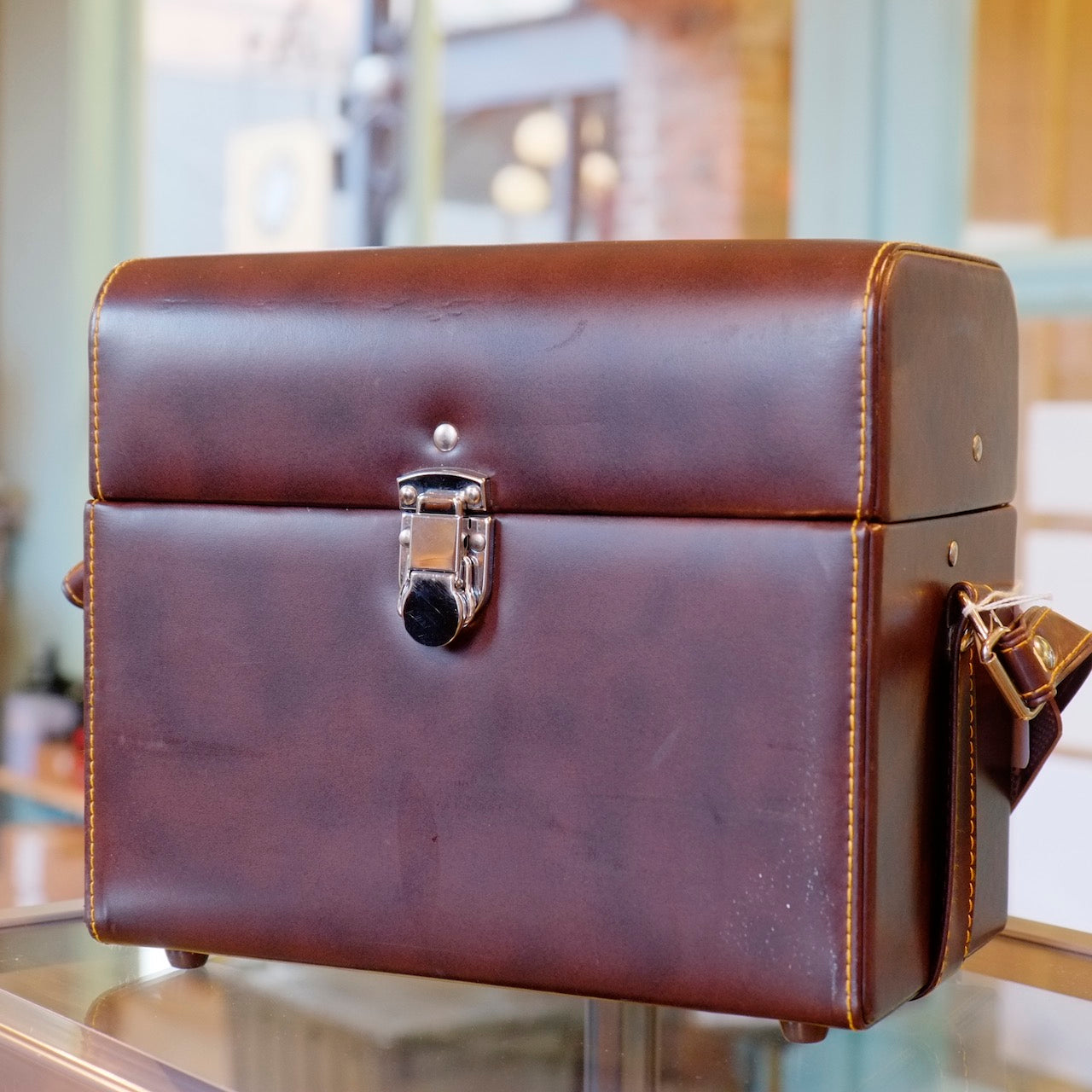 This brown vinyl hardsided case has one main chamber with quite a bit of space and a one-piece flexible divider that could hold up to three lenses. Its also got a fun discreet interior compartment in the top portion of the case. In good condition, with some cosmetic signs of wear. Interior dimensions are approximately 27 x 16 x 14.5 cm.