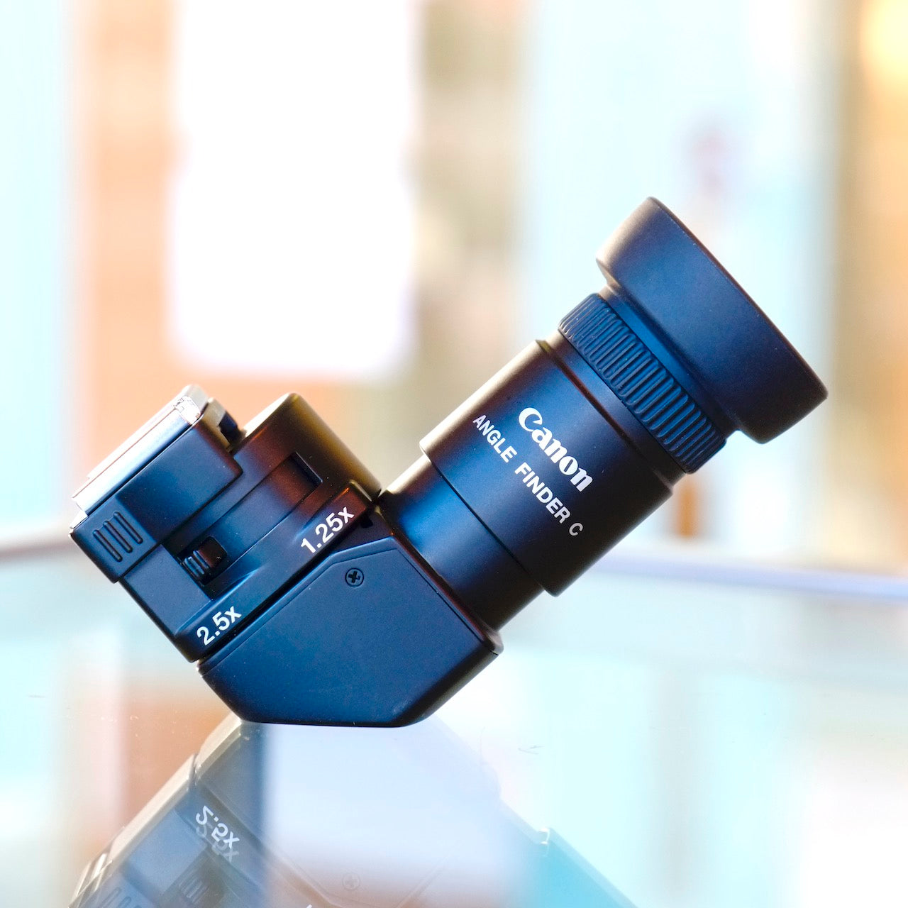 The Canon Angle Finder C rotates 360 degrees with 45 degree interval stops, and offers 1.25x or 2.5x magnification options. Includes both the Ec-C and Ed-C adapters to fit any Canon EOS camera. In excellent condition. Comes with case and original box.