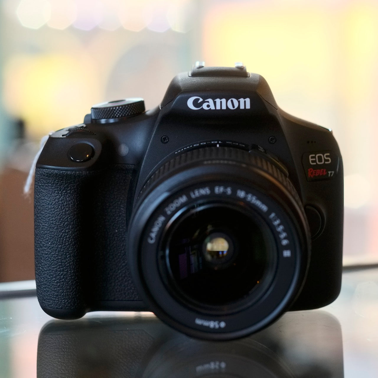 The Canon EOS Rebel T7 is a compact DSLR with a 24mp sensor, 1080p24/30 video recording, and ISO settings to 6400- and it's compatible with the full range of Canon EF lenses (sold separately). In excellent cosmetic condition, with approximately 1100 actuations. Includes Canon battery and charger, strap, and instructions.