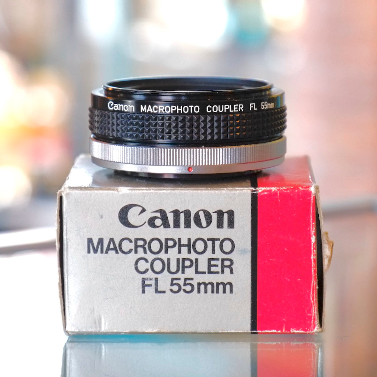 The Canon Macrophoto Coupler FL 55mm is a lens-reversing adjustable extension tube designed for macro use. You can use it directly on-camera or on bellows- it’s totally up to you. Attaches to FD/FL cameras and lenses with 55mm filter threads. In excellent condition, with box.