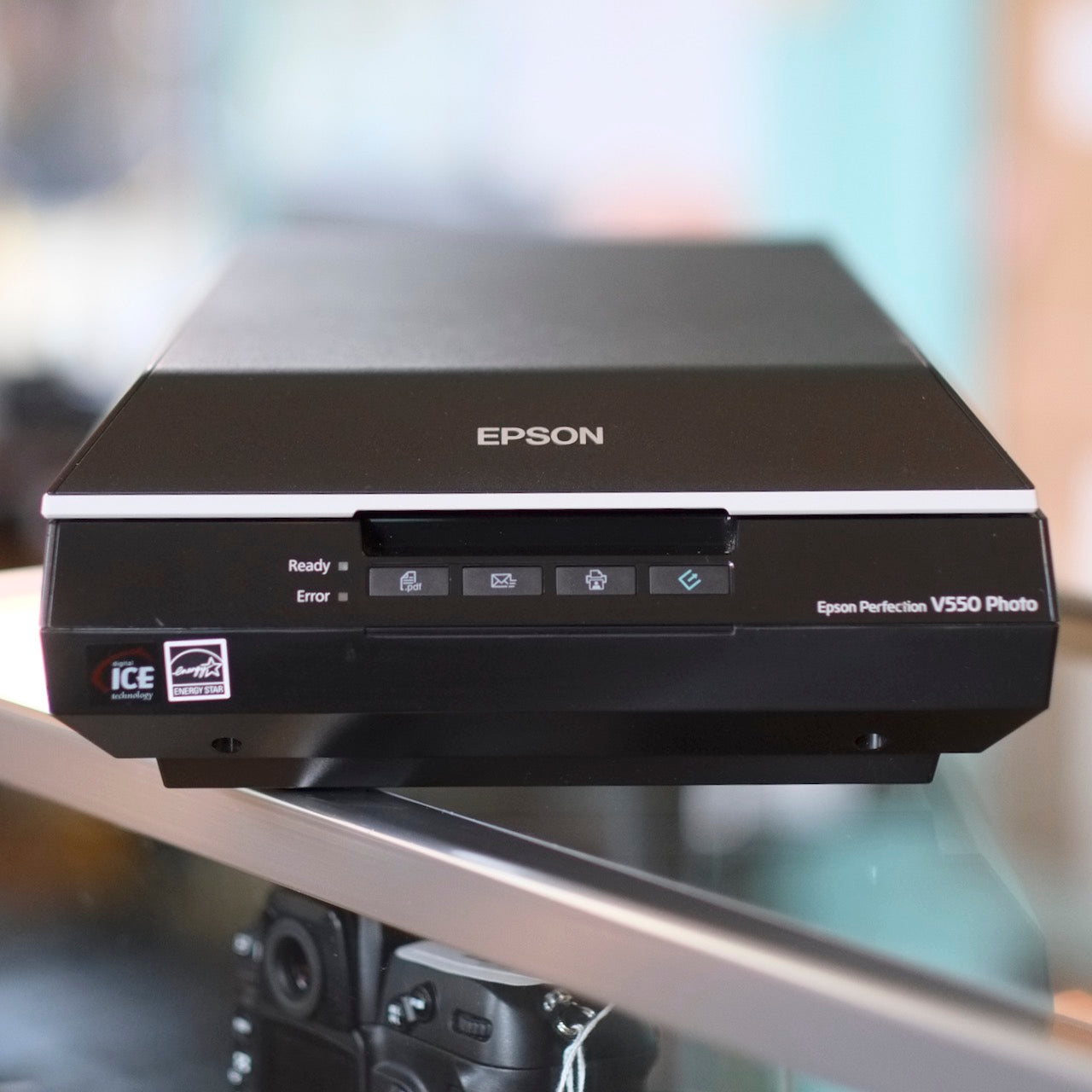 The Epson Perfection V550 is a high quality flatbed scanner that can accommodate 35mm and medium format film. Includes film holders for 35mm and 120, power adapter, and USB cable. Software is not included, but is available for download from Epson. This scanner is also supported by third-party scanning software like Vuescan.