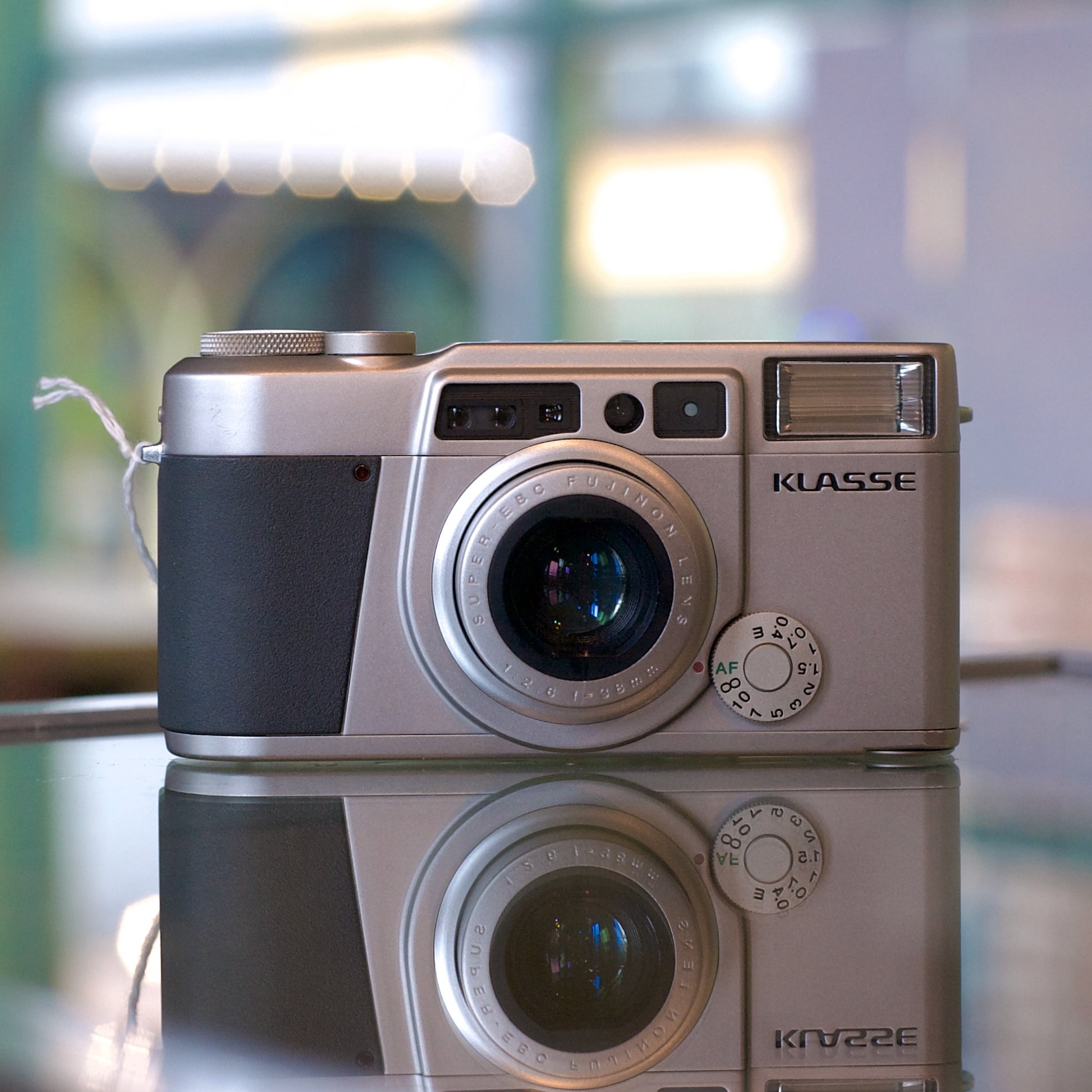 The Fujifilm Klasse is a compact 35mm point & shoot camera with a 38mm f2.6 Fujinon lens and a couple of very handy premium features: aperture-priority autoexposure, a manual scale focusing option, and a bulb mode for long exposures. You can use it as a point & shoot, of course, but the manual flexibility is nice to have. Good functional clean lens. Cosmetic condition is excellent overall, with wear primarily on the film door. Worthy of note: one front corner of the baseplate protrudes very slightly more than we'd expect it to, but there's no sign of impact or other deformation- it's likely just a manufacturing tolerance thing.