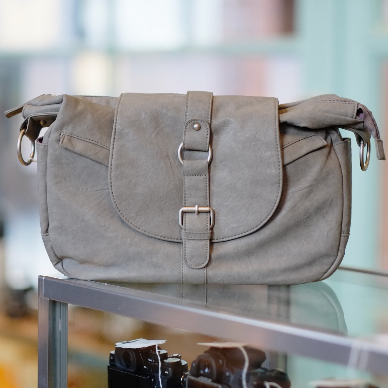 The Kelly Moore B-Hobo is a camera bag that looks like a big purse, which can come in handy if you're shooting an event where a camera bag might stick out too much. The exterior is grey leather-look synthetic, the interior is plum fabric. In excellent condition.