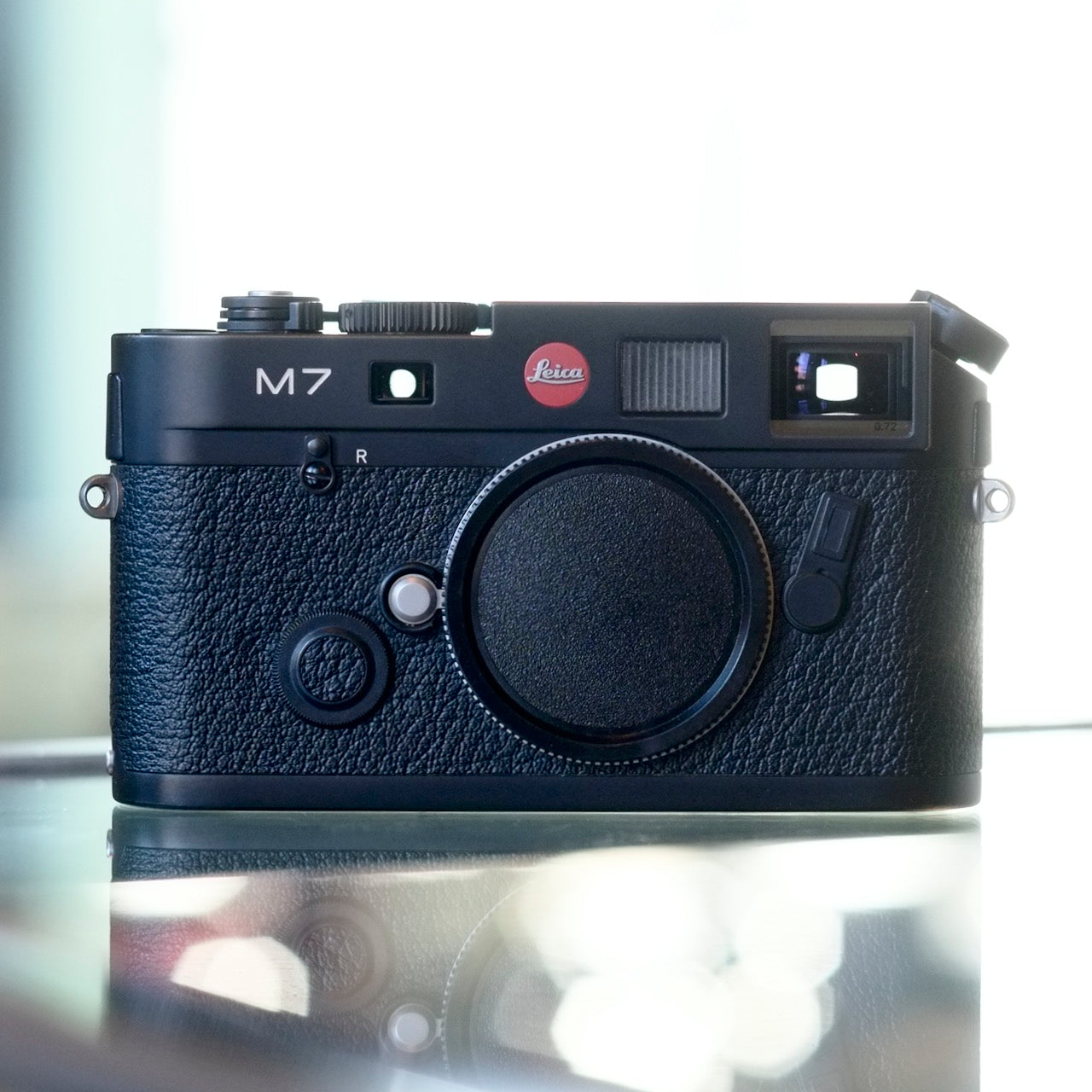 The Leica M7 is a classic film Leica camera with full manual or aperture-priority autoexposure. This is the standard 0.72 variant, with framelines for 28/90 and 35/135mm lenses. In excellent condition overall, with minor cosmetic finish wear, including a few light scuffs on the winder-side rear; metering and shutter speeds are accurate.