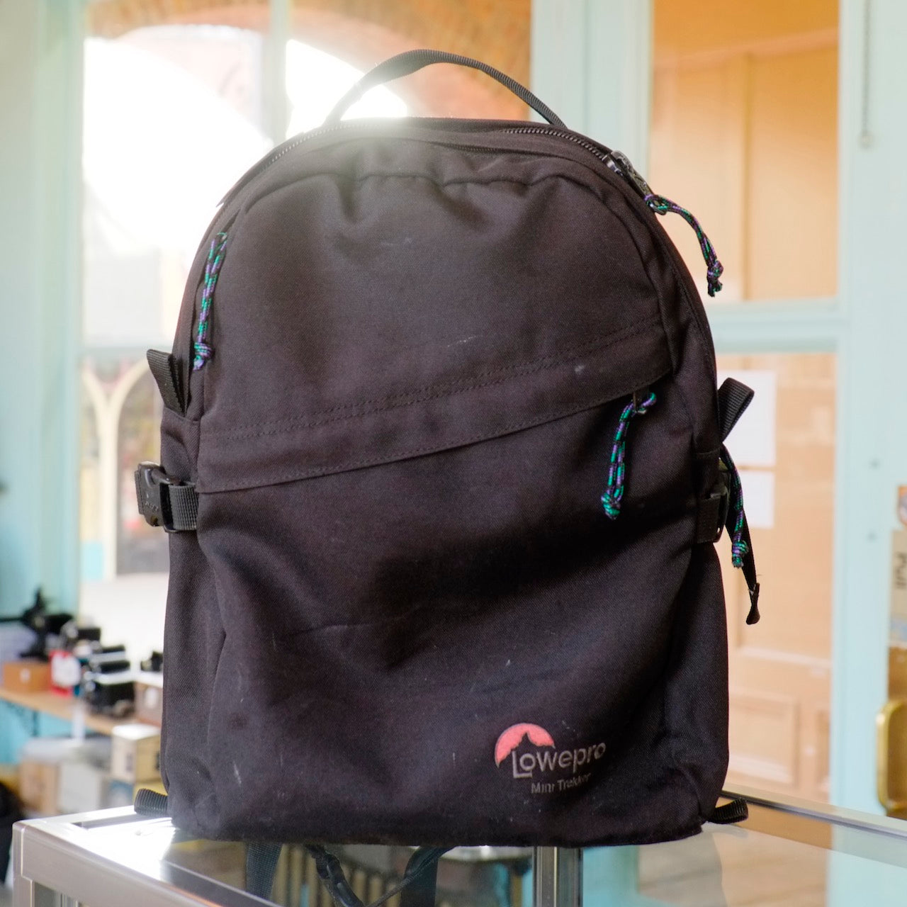 The Lowepro Mini Trekker looks like a classic school backpack, but it has a full set of interior dividers to accommodate a pretty reasonably-sized camera outfit. Cosmetic condition is good, with minor surface wear. Interior dimensions are approximately 12x30x36cm.