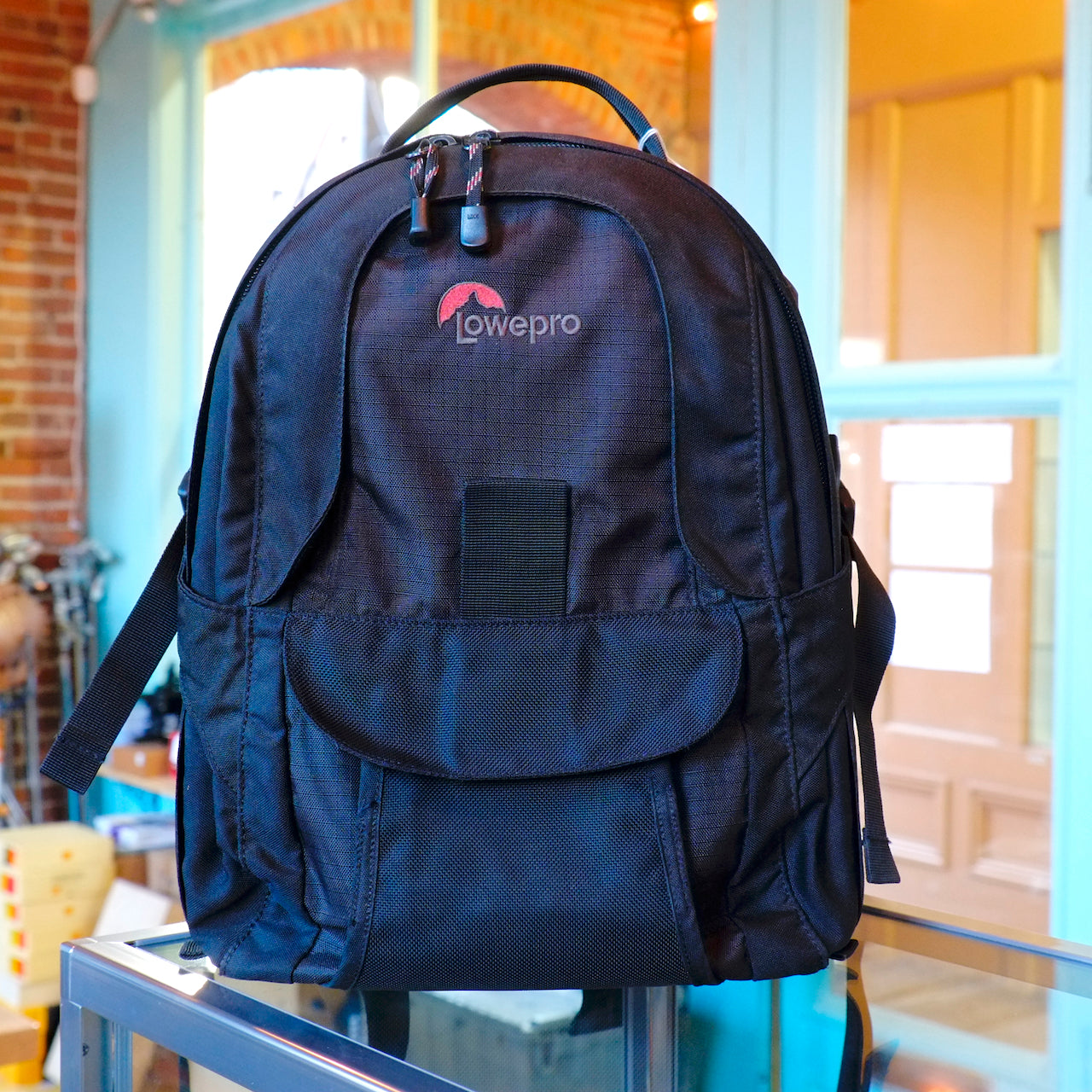 The Lowepro Mini Trekker isn't that mini: it's big enough to hold a reasonably sized camera setup. About the size of a "normal" school backpack, it features a padded compartment with dividers, a couple of front pockets, and provision to attach a tripod. Interior dimensions are approximately 12x30x36cm.