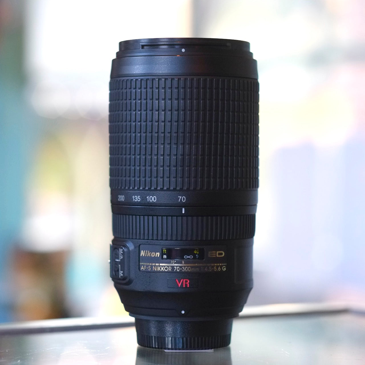 The Nikon 70-300mm f4.5-5.6G ED VR AF-S Nikkor is a full-frame telephoto lens for the Nikon F mount. It has quick AF-S focusing, an effective image stabilizer, and a convenient telephoto zoom range. Suitable for full frame or DX cameras, film or digital (as long as they don't need an on-lens aperture ring, which this lens doesn't have.) In excellent condition, with original hood.