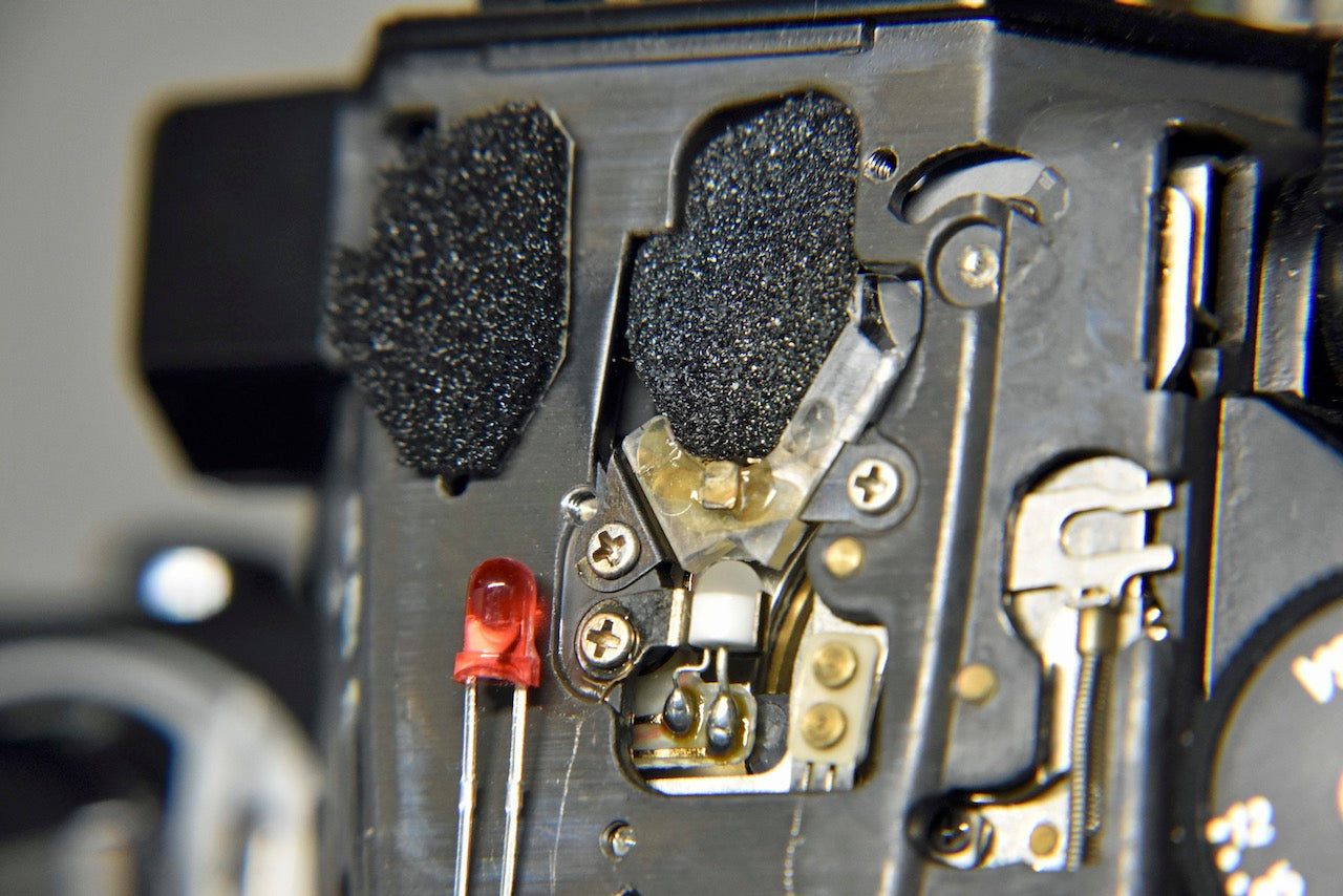 In film cameras, there are usually strips of foam or other material laid into the gaps where the film door meets the body: these help to ensure that the gap is sealed against light and dust. In many older cameras, the foam material has broken down into a sticky goo or a crumbly mess. This is not necessarily fatal- we can replace light seals- but material and labour costs for this work will affect our offer.