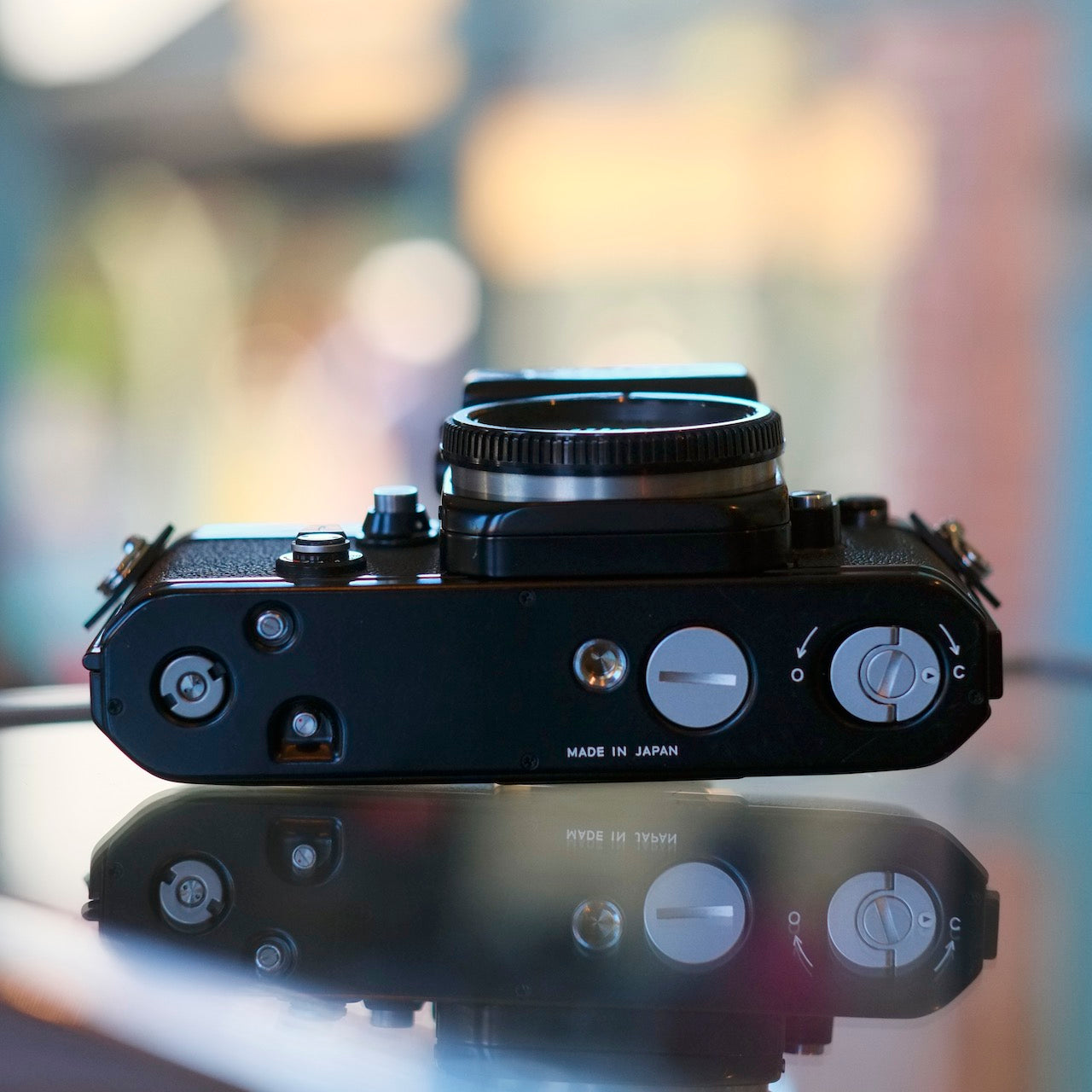 The Nikon F2AS is Nikon's most advanced all-mechanical pro camera, with shutter speeds from 10 seconds to 1/2000s and a DP-12 metering prism compatible with AI and AI-S lenses. It looks great, feels great, and sounds great- a real monument to classic mechanical cameras. This F2AS is in excellent condition, with only minor signs of wear, mostly on the baseplate.