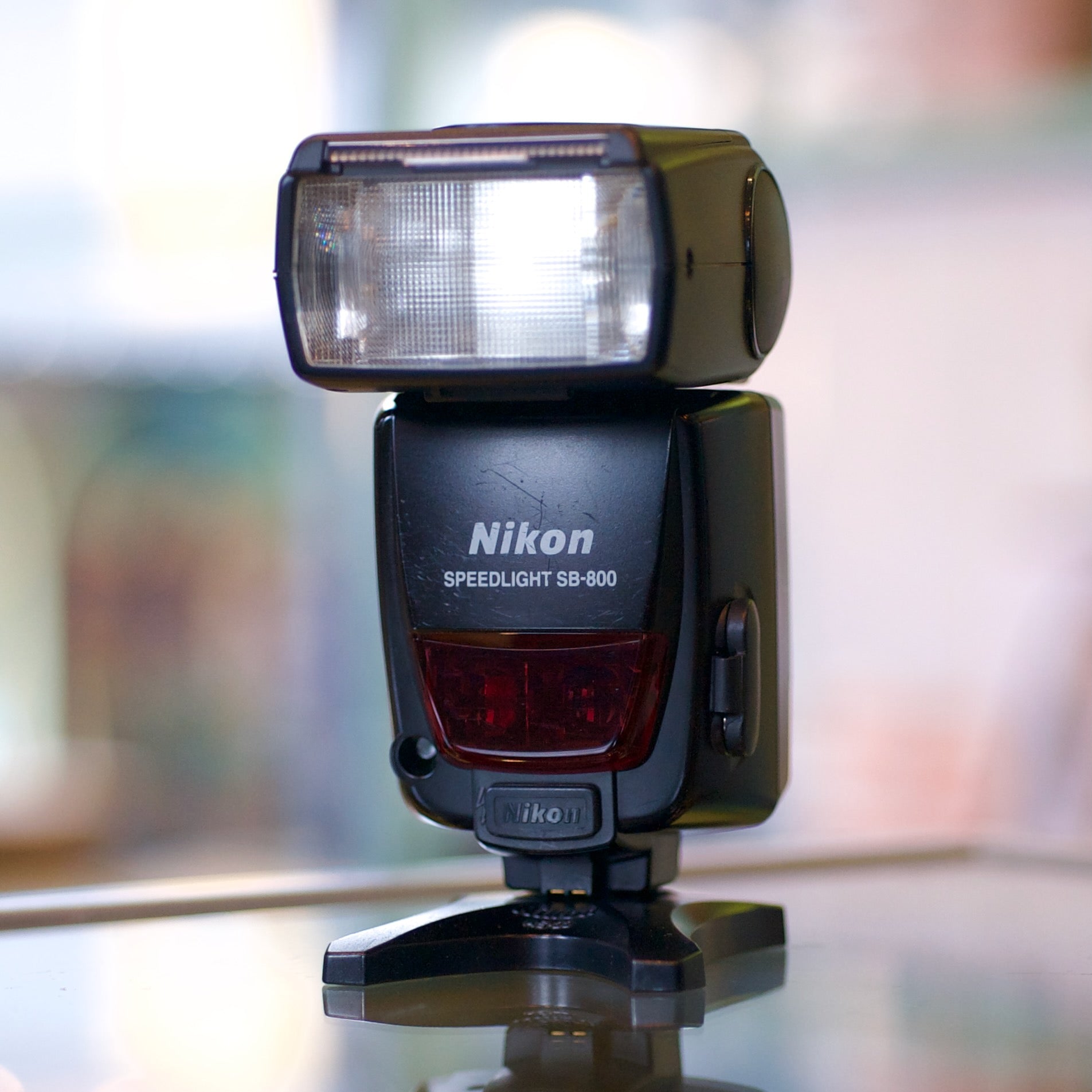 The Nikon Speedlight SB-800 is a professional on-camera flash that provides full manual control on or off camera, plus full TTL cabability on Nikon DLSRs. The SB-800 has a tilting/swiveling/zooming head, a PC sync connector, and Commander capability with compatible cameras and Speedlights. Cosmetic condition is decent, with visible wear; function is good.