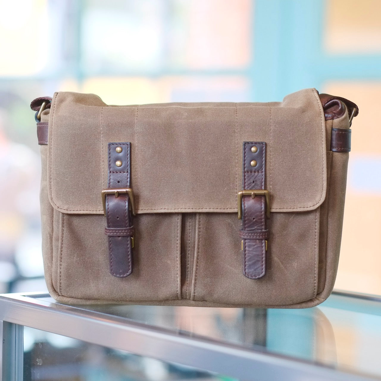 This is Ona's "The Prince Street" bag, a mid-sized messenger-style bag suited to carrying a camera, 11" tablet, and a couple of lenses. The bag is made from sturdy waxed canvas and full-grain leather, and I mean proper leather, not the kind of stuff that has you wondering whether it's legal to call it leather. It's a really nice bag- maybe a bit of an indulgence- but it's certainly not just for show. In excellent condition, with only minor wear from light use. Interior dimensions are approximately 10x22x30cm.