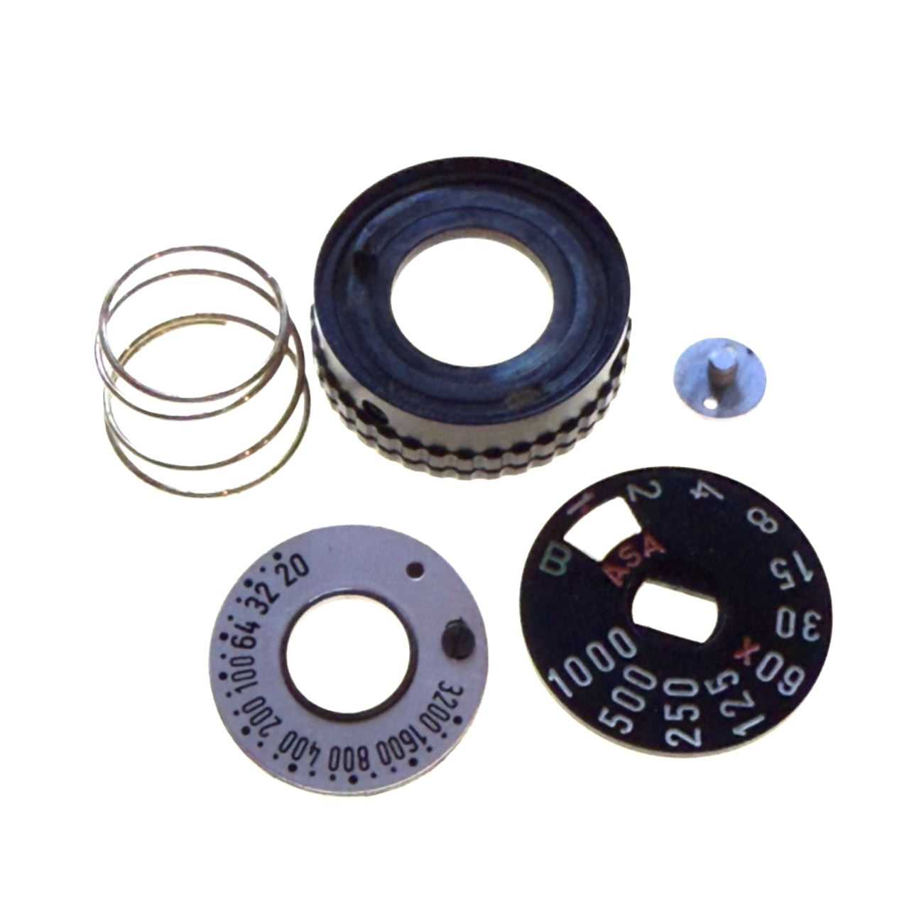 An original Pentax shutter speed dial for the Pentax K1000 camera (Japan/HK production). Includes outer dial, spring, ISO dial, shutter speed dial, and retaining screw, as shown.
