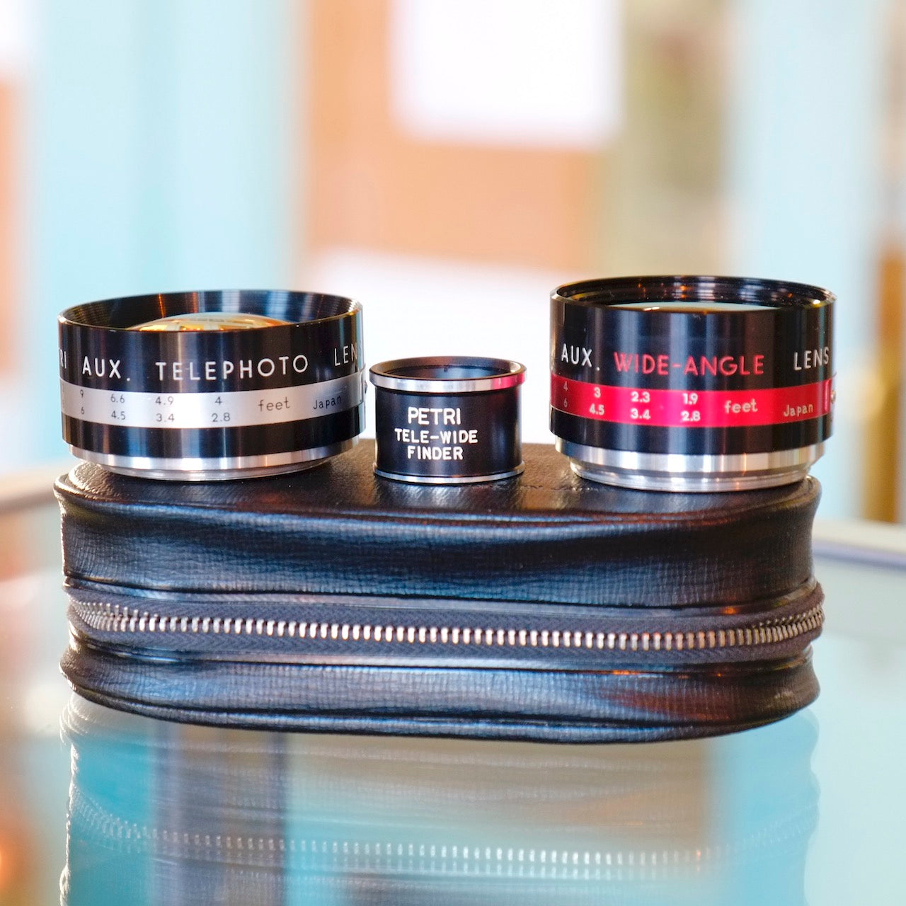 This is a Petri-Aux lens set for the Petri 7s camera, including Tele-Wide Finder. It's in good condition, with minor signs of wear. The set also has a Telephoto Lens and a Wide-Angle Lens for 45mm f1.9. In very good cosmetic condition, with minor signs of wear. Comes with original case.