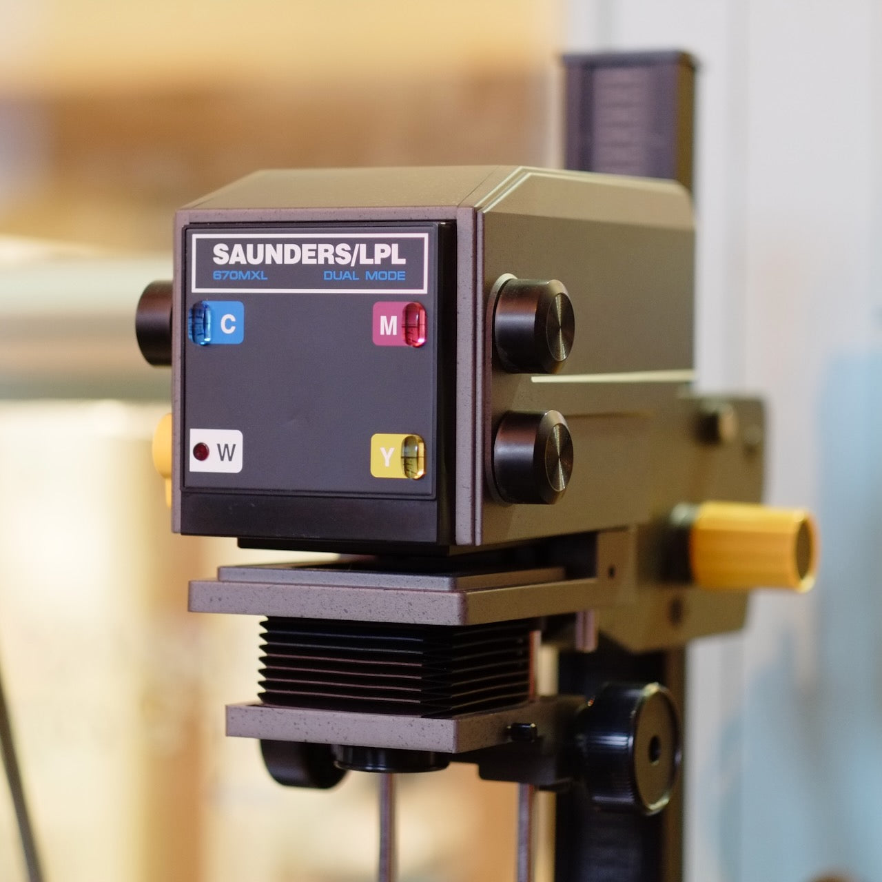 The Saunders/LPL 670MXL is a quality enlarger with a dichroic head, suitable for black and white or colour enlarging. In excellent condition, with inserts for 35mm negative, 35mm slide, and 6x6cm. Includes a Schneider Componon-S 50mm f2.8 lens. The enlarging head is removable, allowing the stand to be used as a copystand with the included 3/8" thread adapter (camera mounting requires a tripod head or 1/4" adapter, not included.)