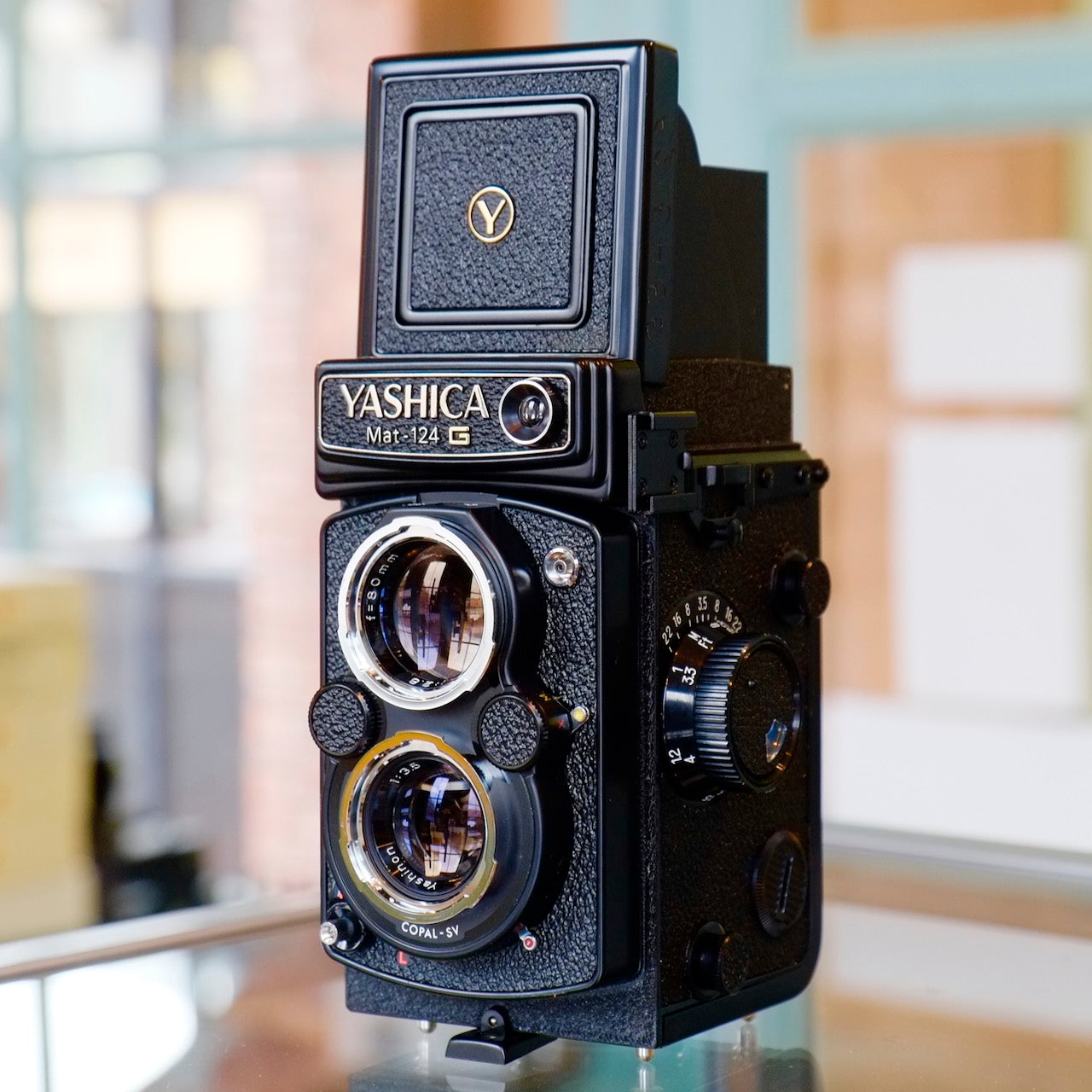 This is a classic medium-format TLR camera with an 80mm f3.5 Yashinon lens that shoots 6x6cm images on 120 rollfilm. CLA'd by Yashica specialist Mark Hama, functionally and optically excellent, with accurate shutter speeds and metering, and calibrated to use longer-lasting 1.5v batteries. It includes its original case, strap, UV filter (in original box) and Yashica lens shade (also with box), all in similar near-new cosmetic condition.