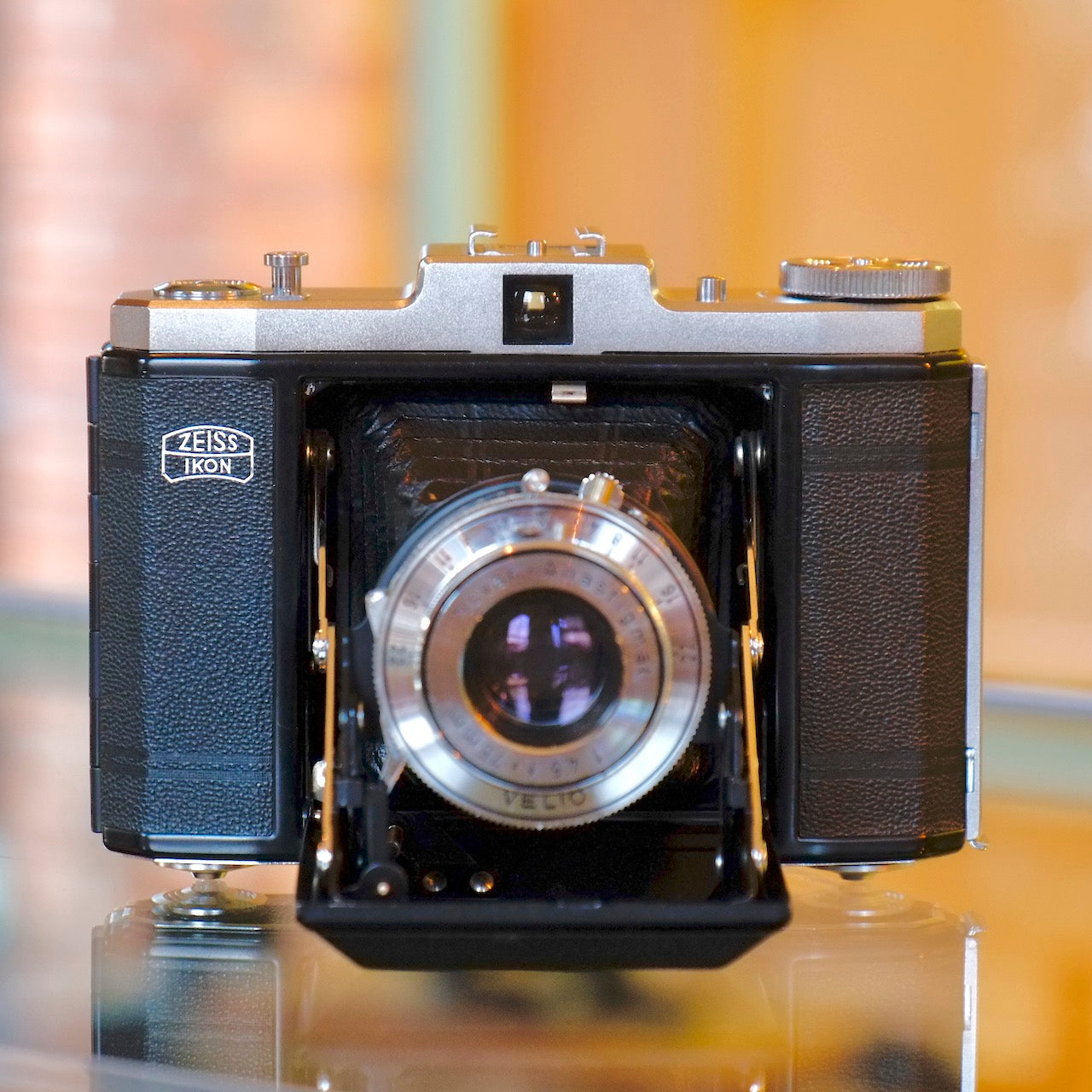 The Zeiss-Ikon 518/16 is a compact folding camera that shoots 6x6cm exposures on 120 rollfilm. It's equipped with a scale-focusing 75mm f4.5 Novar Anastigmat lens in a five-speed Velio shutter. This Nettar is in excellent condition, with only minor cosmetic wear. Lens is clean, bellows are good, and the shutter works well from 1/25s on up (1/10s is a bit sluggish). About as close to pocketable as medium format gets.